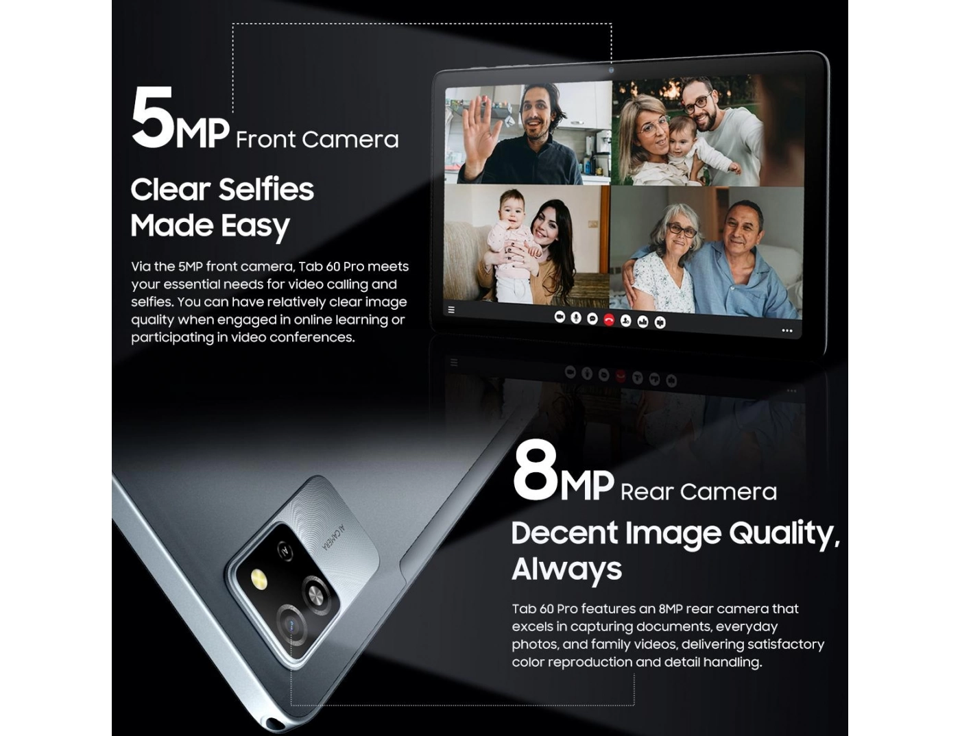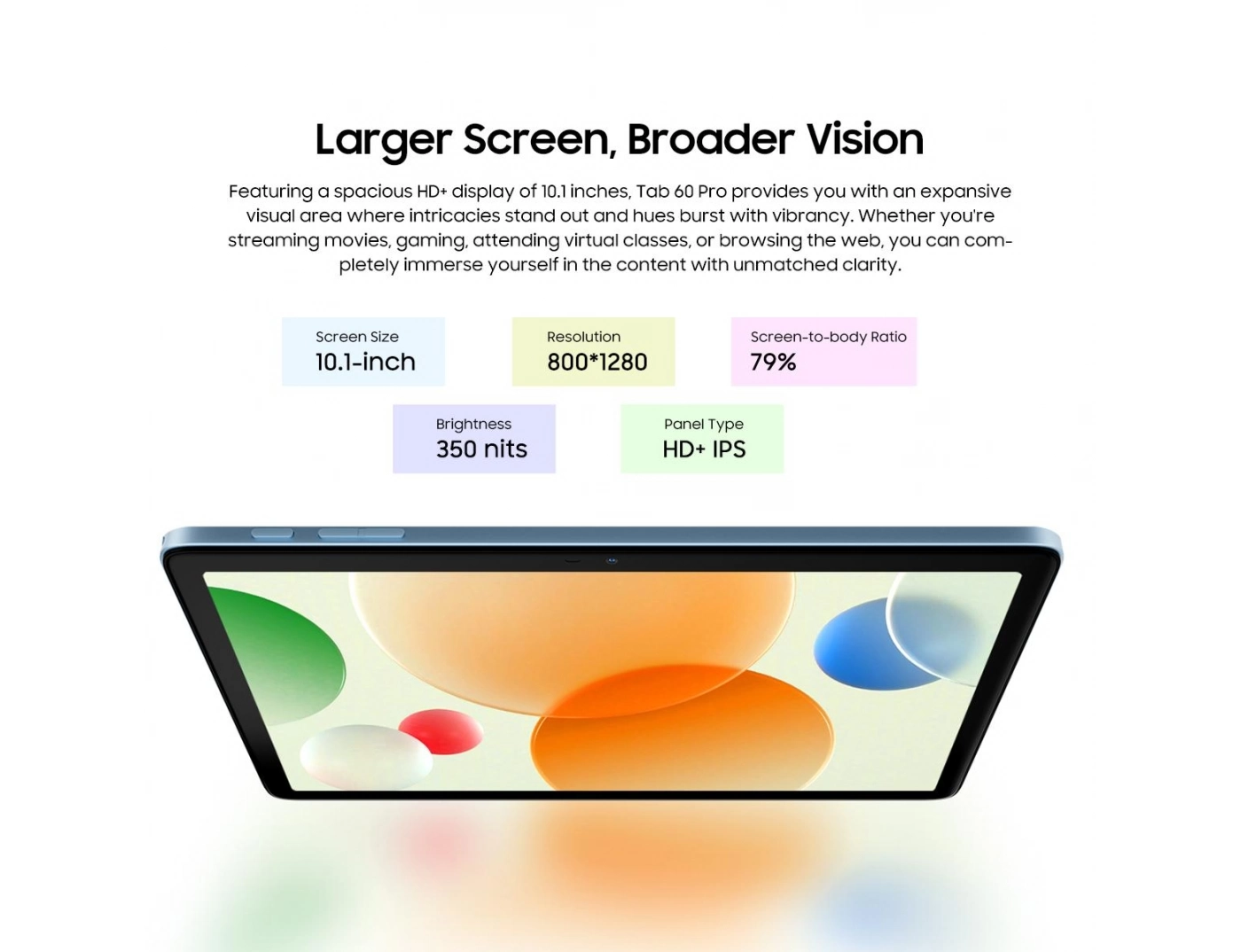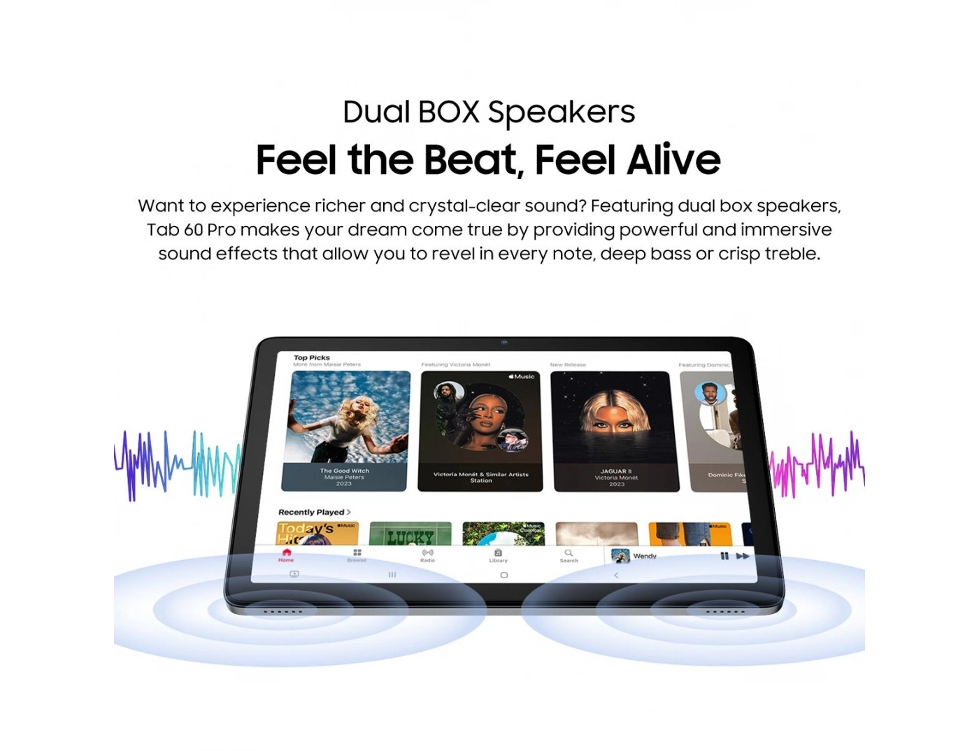 Με διπλά ηχεία υψηλής ποιότητας, το Tab 60 Pro απο delivers καθηλωτική ηχητική εμπειρία. Οι λεπτομέρειες στον ήχο, οι καθαρές υψηλές συχνότητες και τα βαθιά μπάσα δημιουργούν ένα πλούσιο ηχητικό περιβάλλον που αναδεικνύει ταινίες, μουσική και παιχνίδια.